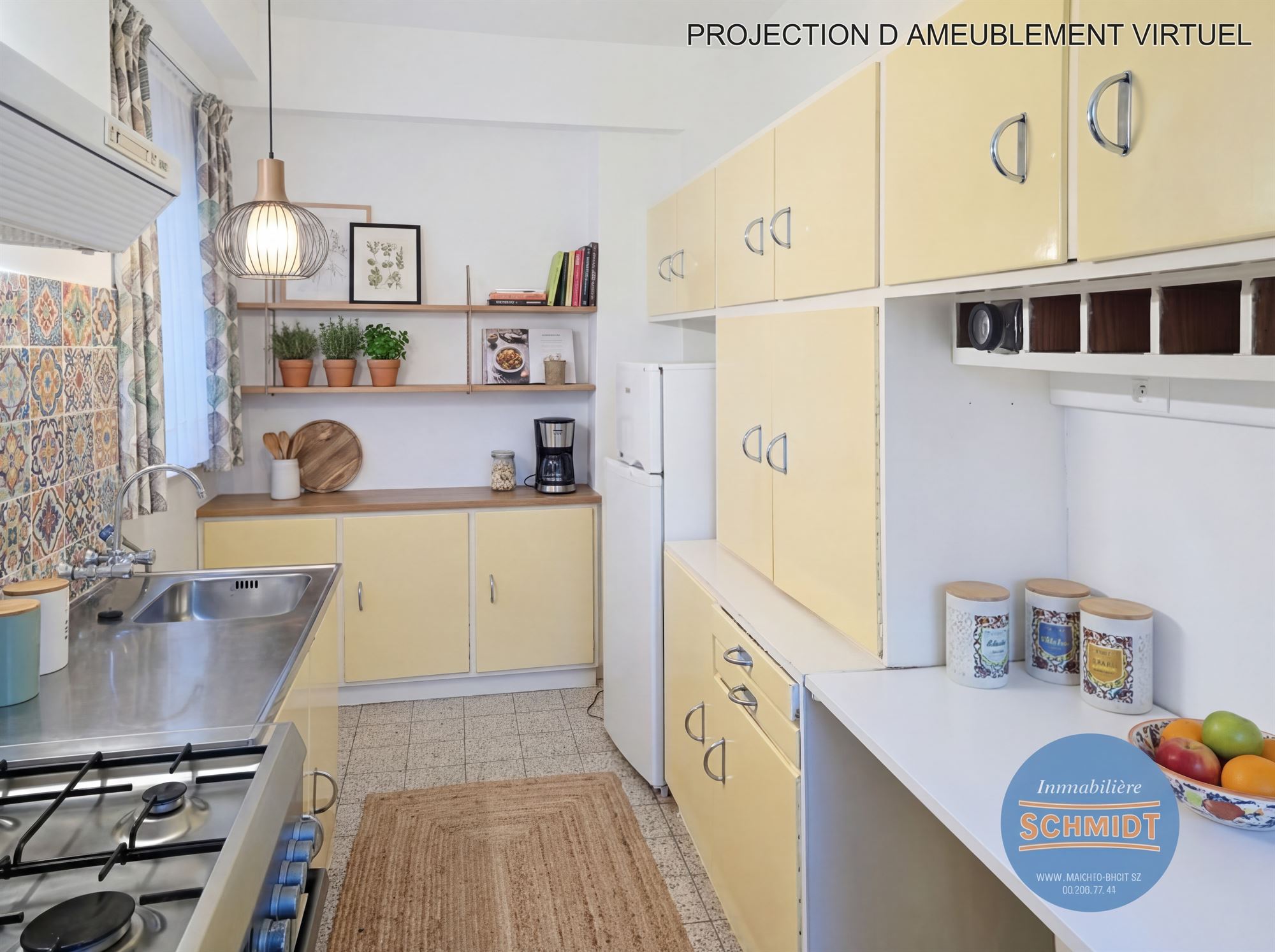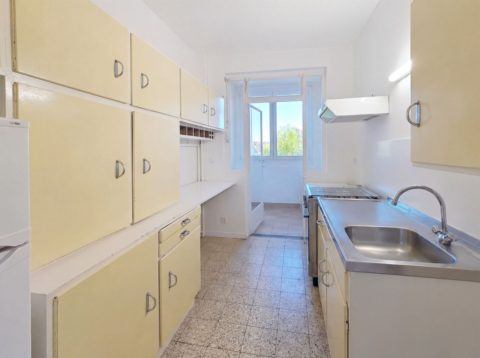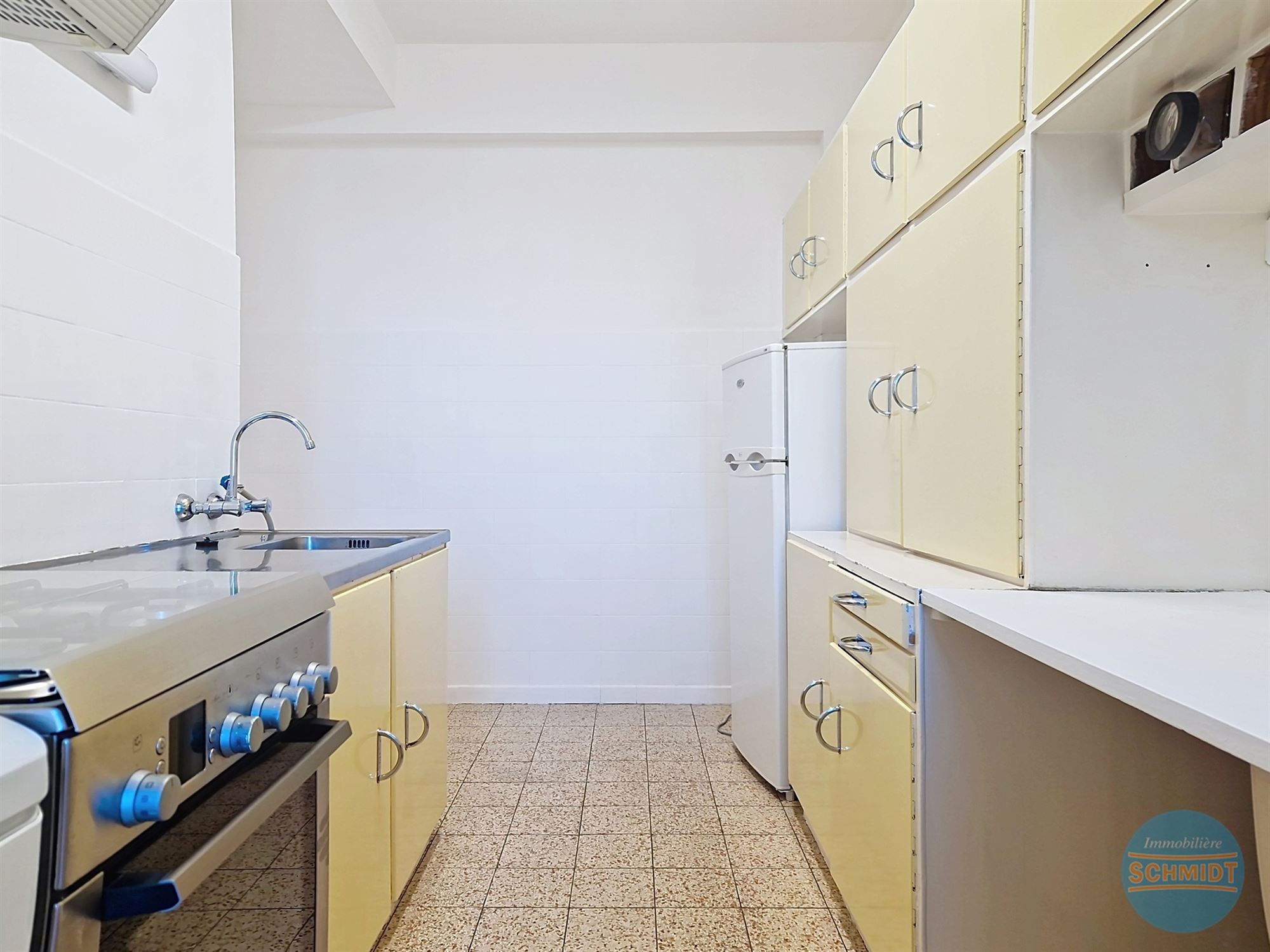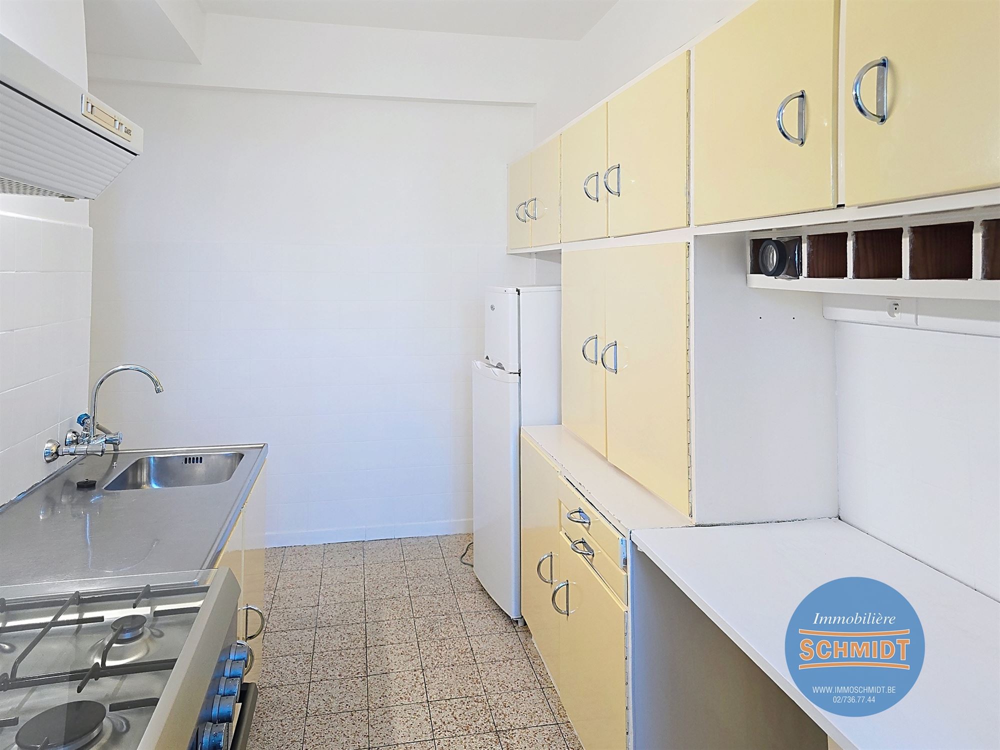 Cuisine super équipée ±8m² (3.65 x 2.15) (1.35 x 0.7) meubles, évier, hotte, cuisinière au gaz + four, frigo/surgélateur / Carrelage