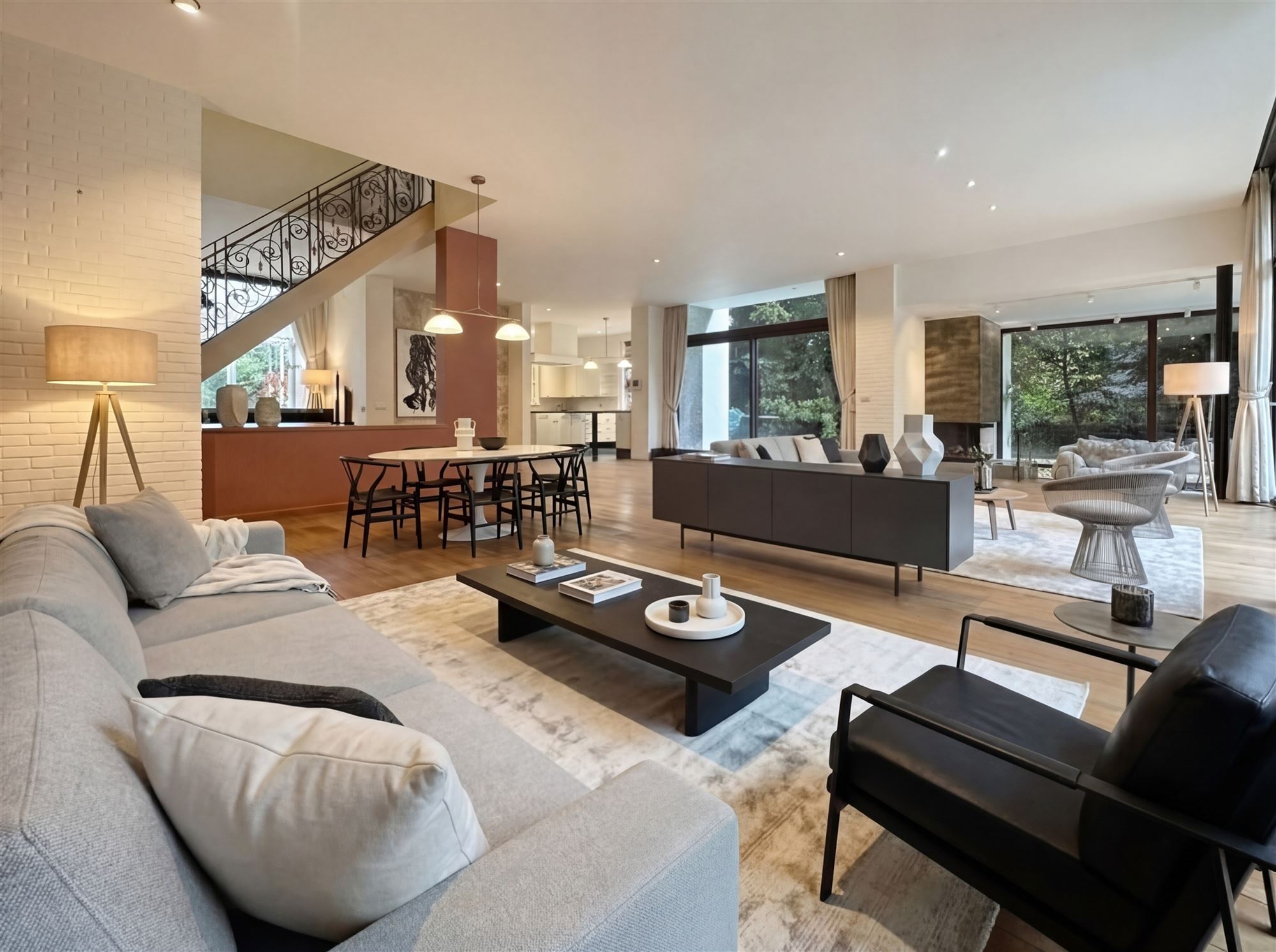 Impressionnant séjour de 86 m² : salon, coin lecture avec feu ouvert et salle à manger ouvrant sur la terrasse