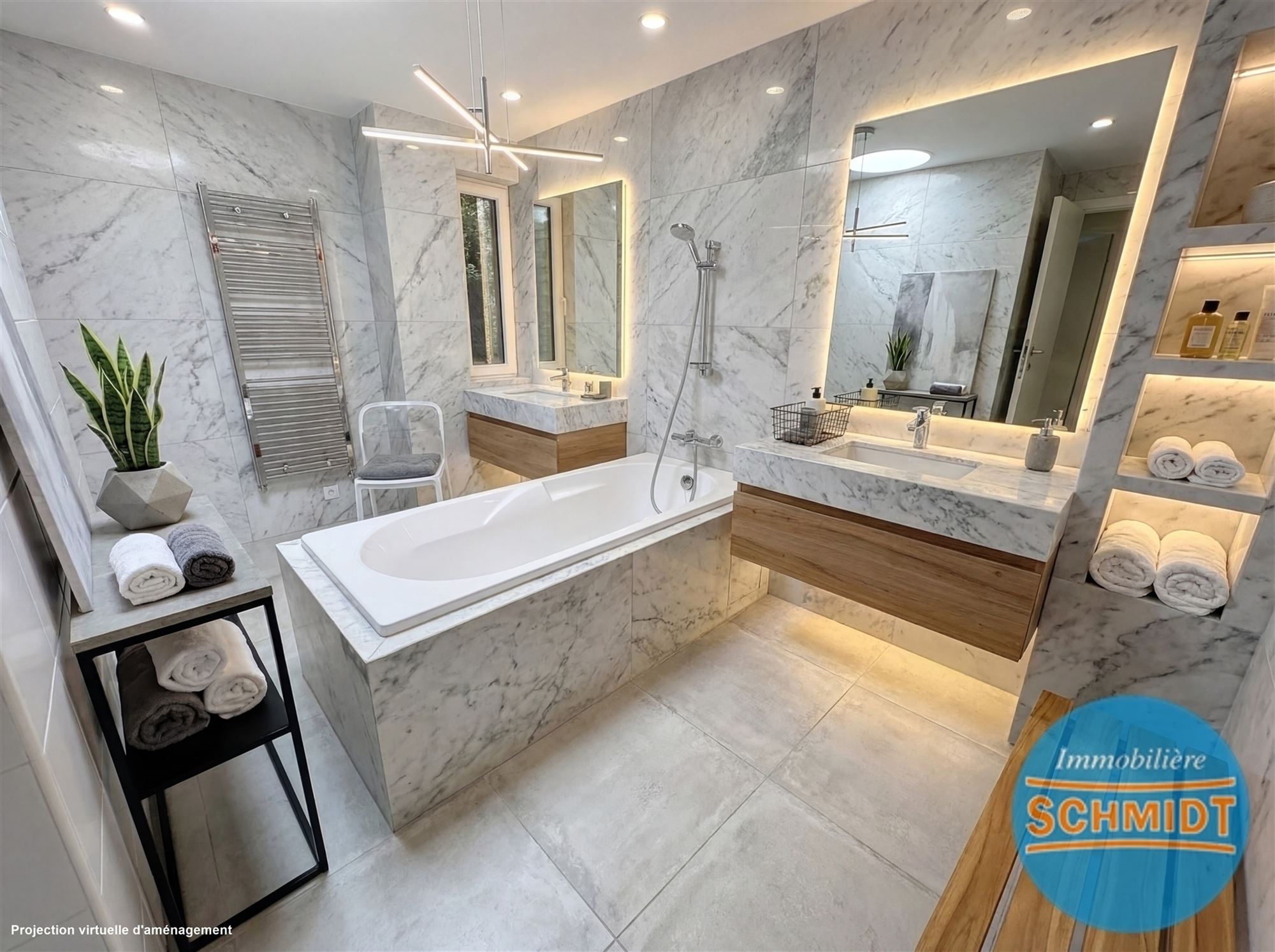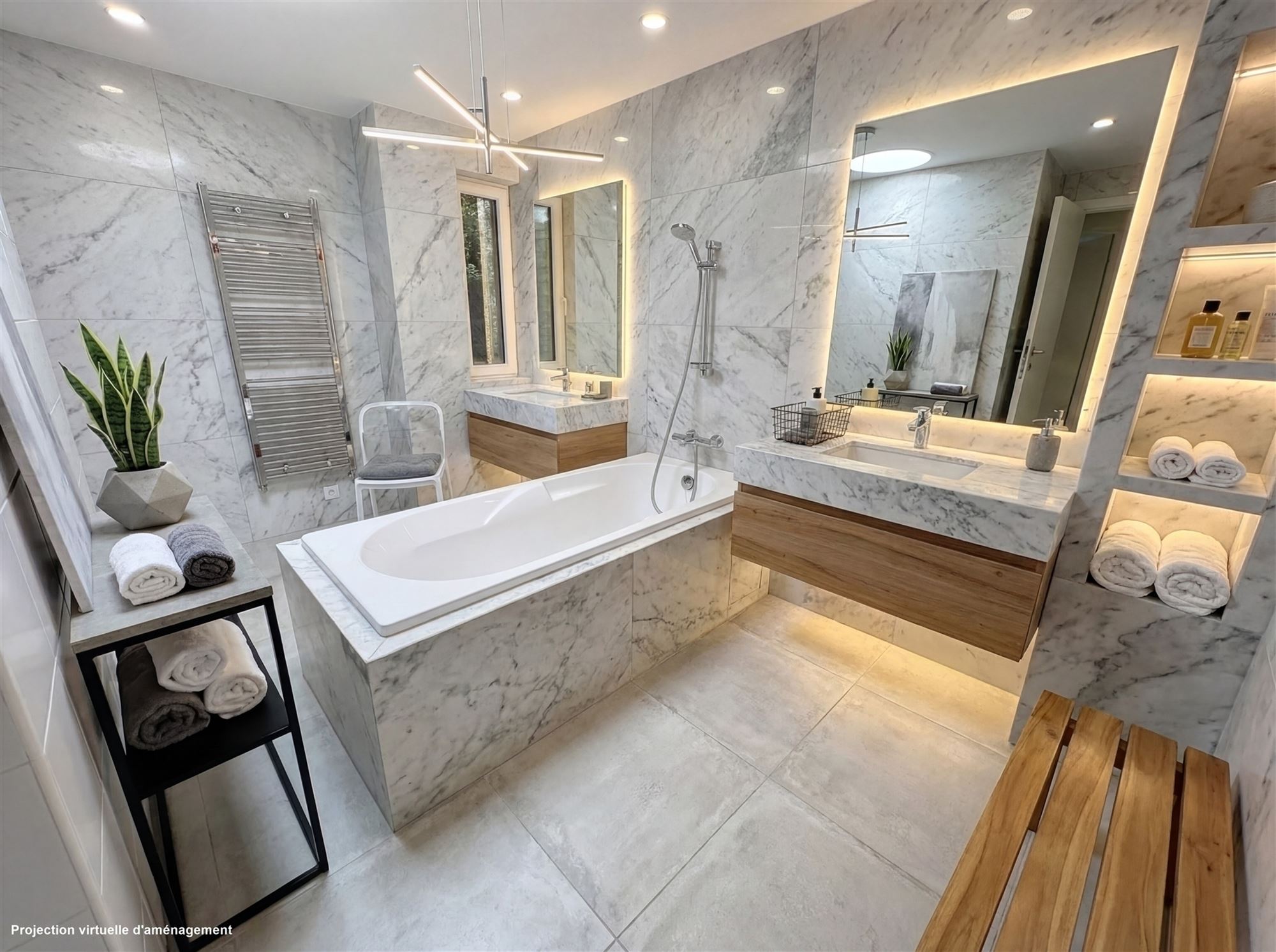 Salle de bains double accès, baignoire centrale et double lavabo